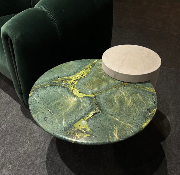 Made of a cylindrical base in gray limestone contrasting with a colorfull marble top, the Bite table fits in with a contemporary and minimalist style.
