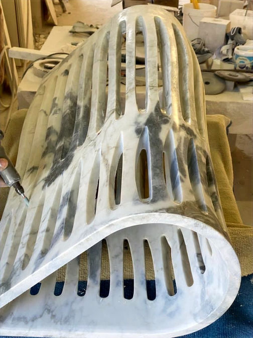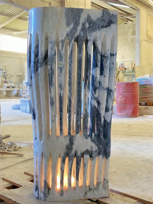 This unique piece features a modern design and is bespoke, crafted to meet specific requirements. The openings in the marble allow for the projection of light in a distinctive way, creating an intriguing and captivating atmosphere in the surrounding space.