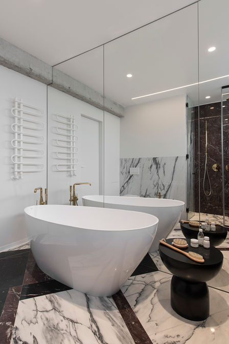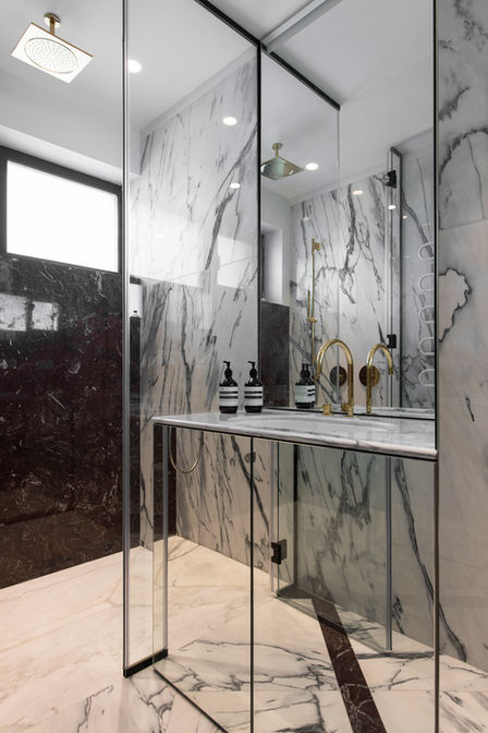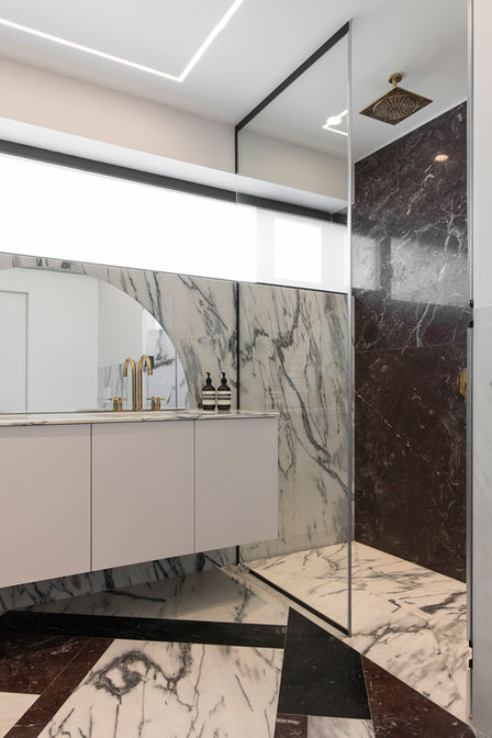 Bathroom featuring Portuguese Calacatta Nero Marble and Rosso Levanto Marble. Calacatta Nero is a white marble with delicate gray-blue veins, while Rosso Levanto exhibits a rich Bordeaux color. The combination of these marbles creates an elegant and modern ambiance. The irregular pattern of the floor, combining different marbles, adds a unique touch.