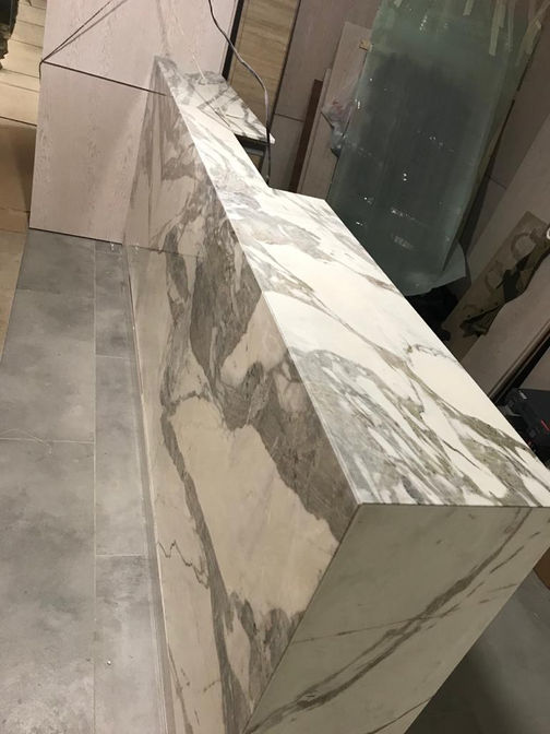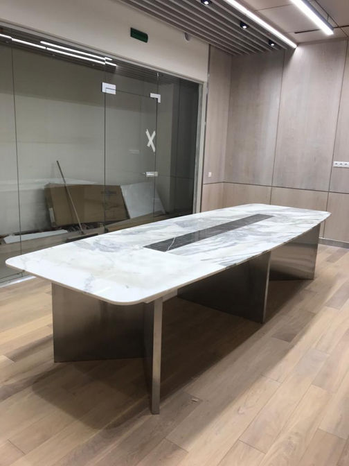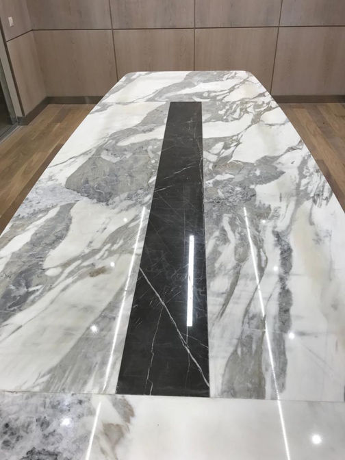 Calacatta PT Marble used in various elements of an office (conference tables and countertop cladding). This marble is characterized by its white color with brown veins. The use of Calacatta PT Marble brings sophistication and a sense of luxury to the office environment.