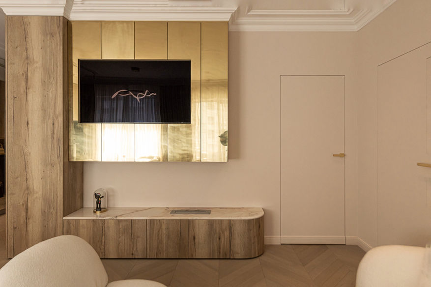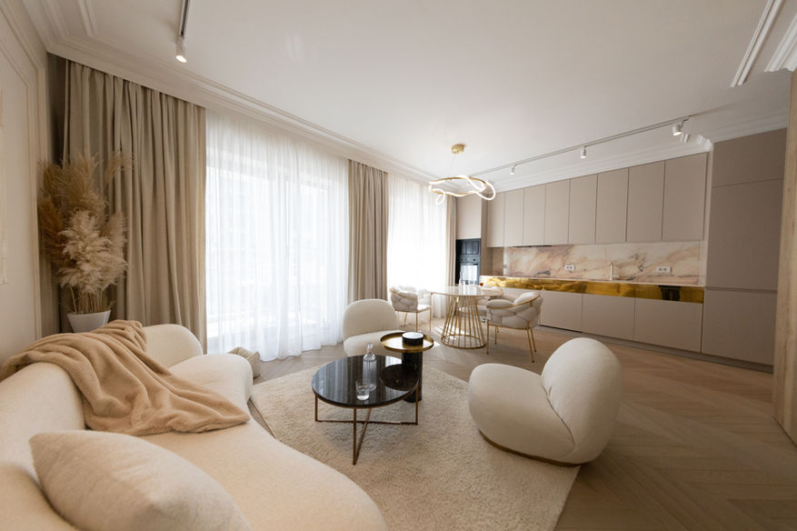 Calacatta Rose marble showcases a creamy pink color, resulting in a warm and inviting atmosphere. The kitchen exudes a modern and elegant style, with a harmonious blend of cream tones.