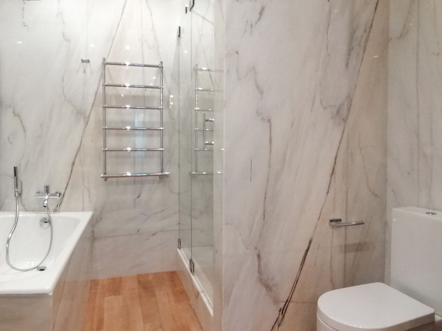 Bathroom with Estremoz Venato Marble. The entire space is adorned with exquisite Estremoz Venato Marble, creating a serene and sophisticated atmosphere. The smooth white surfaces, adorned with delicate veins, exude elegance and purity. This simple yet luxurious design transforms the bathroom into a haven of tranquility, offering a harmonious blend of functionality and timeless beauty.