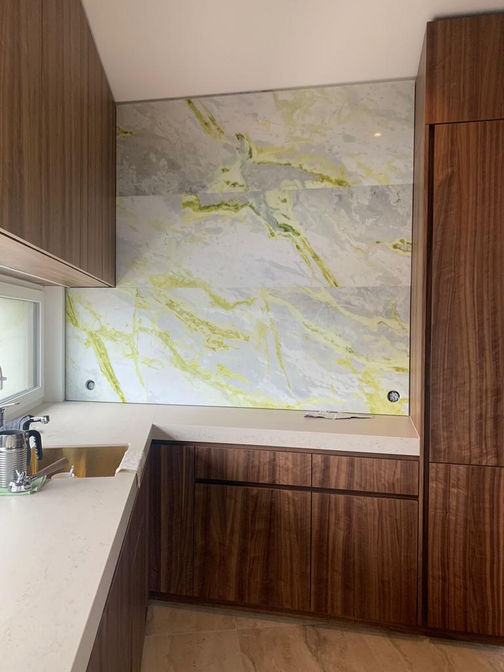 Wall cladding in Luminus Marble. This exotic marble features a white base with fluorescent green veins, adding a vibrant and eye-catching element to any room. The Luminus Marble wall cladding becomes a focal point, captivating attention and creating a stunning visual impact. The marble is also used for the fireplace cladding, enhancing the overall coherence of the design.