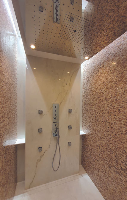 This stunning bathroom is adorned with Rosa Aurora marble, used for wall and floor cladding as well as a bespoke solid marble washbasin. Characterized by its soft pink tones, the marble harmonizes beautifully with the mosaic details, creating a warm and inviting ambiance. The refined combination of materials and the craftsmanship behind the custom-made features make this bathroom a true testament to elegance and luxury.