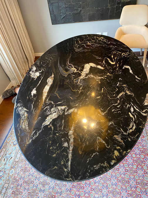 Oval dining table made of Texta Titanium Granite. Serving as the central element of the room, this bespoke table is crafted from black granite with golden veins. The Texta Titanium Granite not only adds visual interest but also ensures durability. The table is a perfect blend of style and resilience.